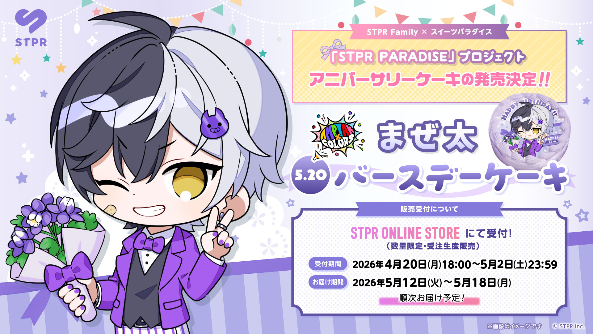 2026年5月20日に誕生日を迎える『STPR PARADISE アニバーサリーケーキ』まぜ太 (AMPTAKxCOLOR) のアニバーサリーケーキを、2026年4月20日(月)18時よりSTPR ONLINE STOREにて順次受付を開始いたします。